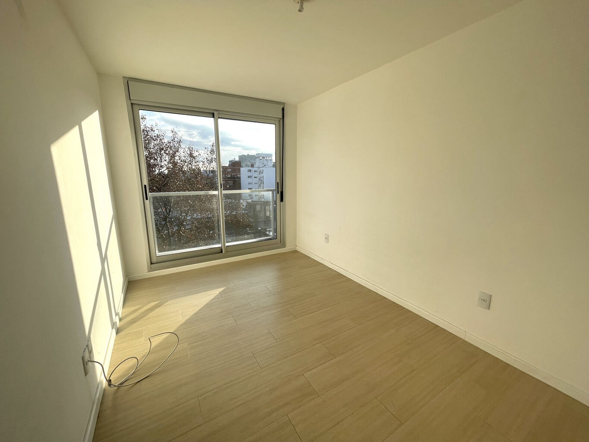 Dormitorio al frente con placar cuatro puertas, persiana de enrollar, ventanal hasta el piso con baranda de seguridad.